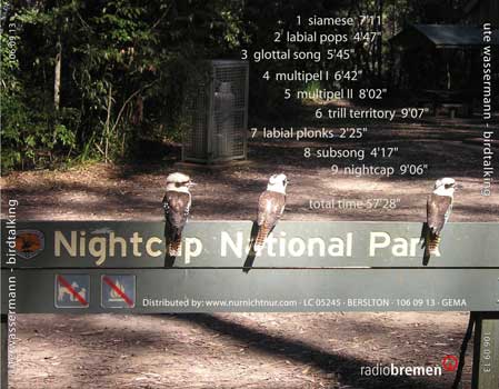 Ihrem Selbstverständnis nach ist Ute Wassermann Vokalartistin und Komponistin. Nach einer klassischen Gesangsausbildung begann sie 1984 neue Vokaltechniken zu entwickeln und zu erforschen. Man mag sie zusammen mit Jaap Blonk zu den schillerndsten Figuren der sound poetry zählen und wird ihr damit doch nicht umfassend gerecht. Denn mit ihrer neuen Produktion birdtalking lauscht sie einerseits der poetischen Schönheit von Vogelstimmen-Dialogen oder Monologen nach und der darin verborgenen Semantik, andererseits führt sie die Hörer durch ein verwirrend vielfältiges Arsenal moderner Vokaltechniken und entwickelt in neun Takes wie Siamese, labial pops oder glottal song ein Etüdenwerk avantgardistischen Gesangs. Nach einer knappen Stunde lässt sie ihre Hörer ganz und gar fasziniert von der Schönheit ihrer Stimm-Akrobatik zurück, die aber stets geleitet wird von einem |